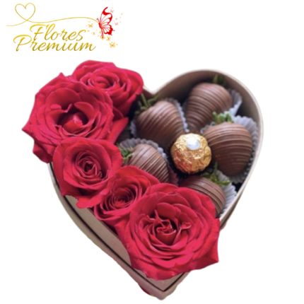 CAJA CORAZON DE 6 ROSAS Y 7 FRUTILLAS