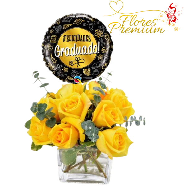 CUBO DE 10 ROSAS Y GLOBO GRANDE