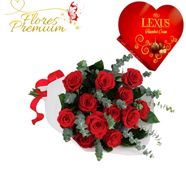 RAMO 12 ROSAS, FOLLAJE Y BOMBONES CORAZON