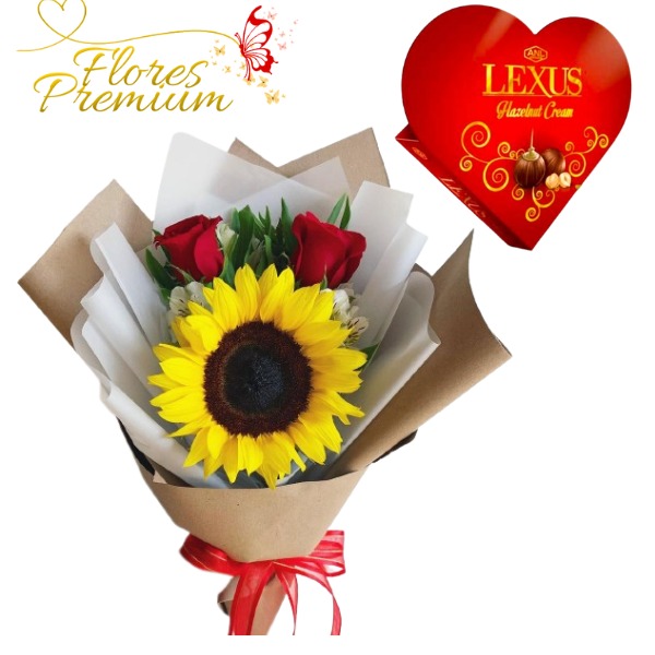 RAMO 2 ROSAS, 1 GIRASOL Y BOMBONES CORAZON
