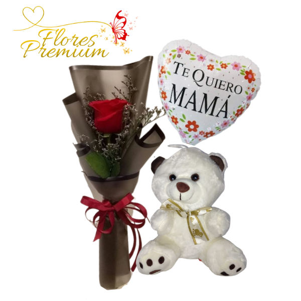 RAMO DE 1 ROSA, PELUCHE DE 20CM Y GLOBITO